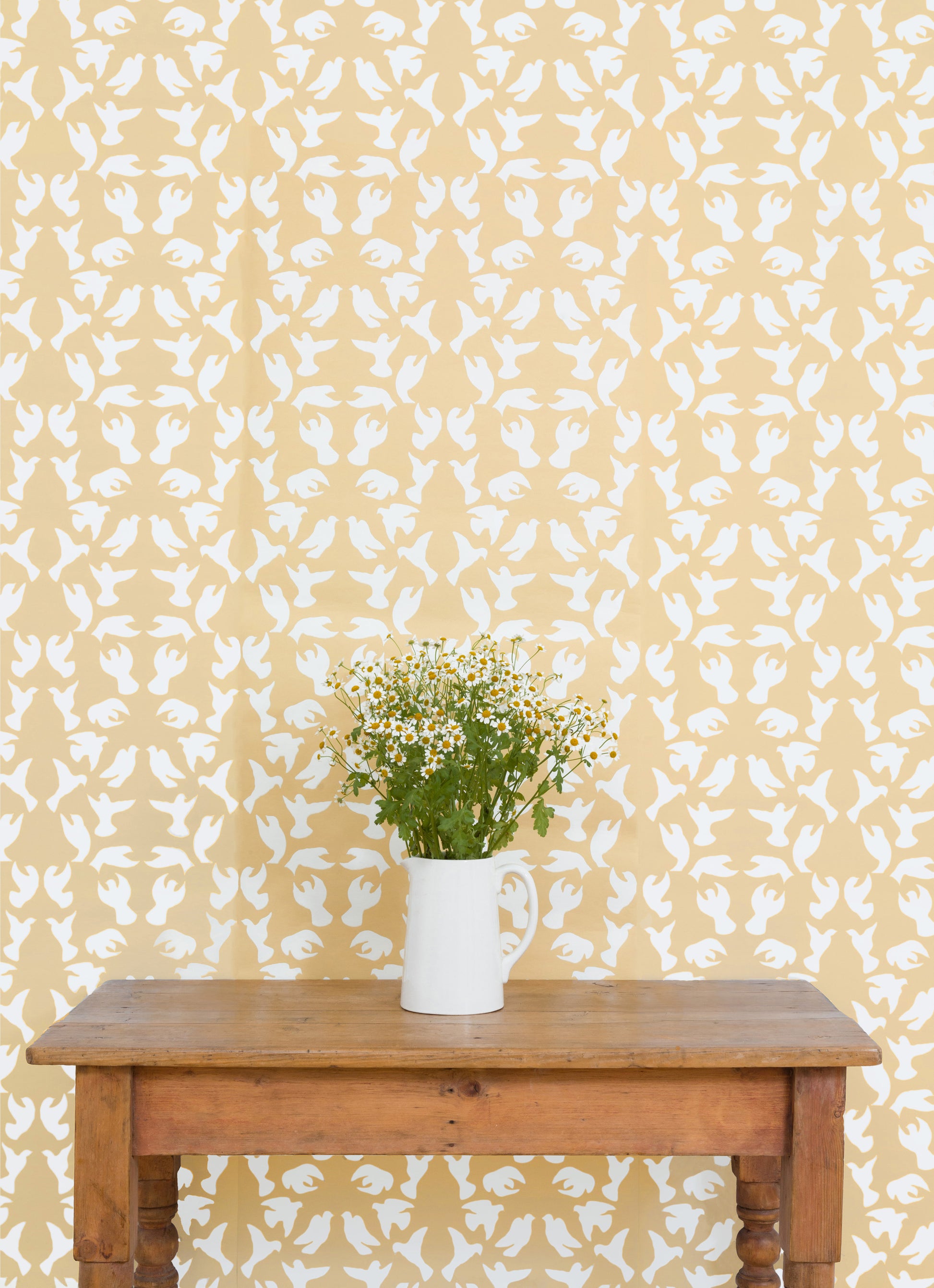 Bring warmth to any room with this playful, contemporary take on a formal damask design in which vanilla white doves dance against a gorgeous sandy yellow. Hand drawn from close observation of the shapes made by these beloved birds in flight, this stylised and clean-lined design brings the sunshine indoors whether as an update to a traditional space or uplift in a more modern setting.